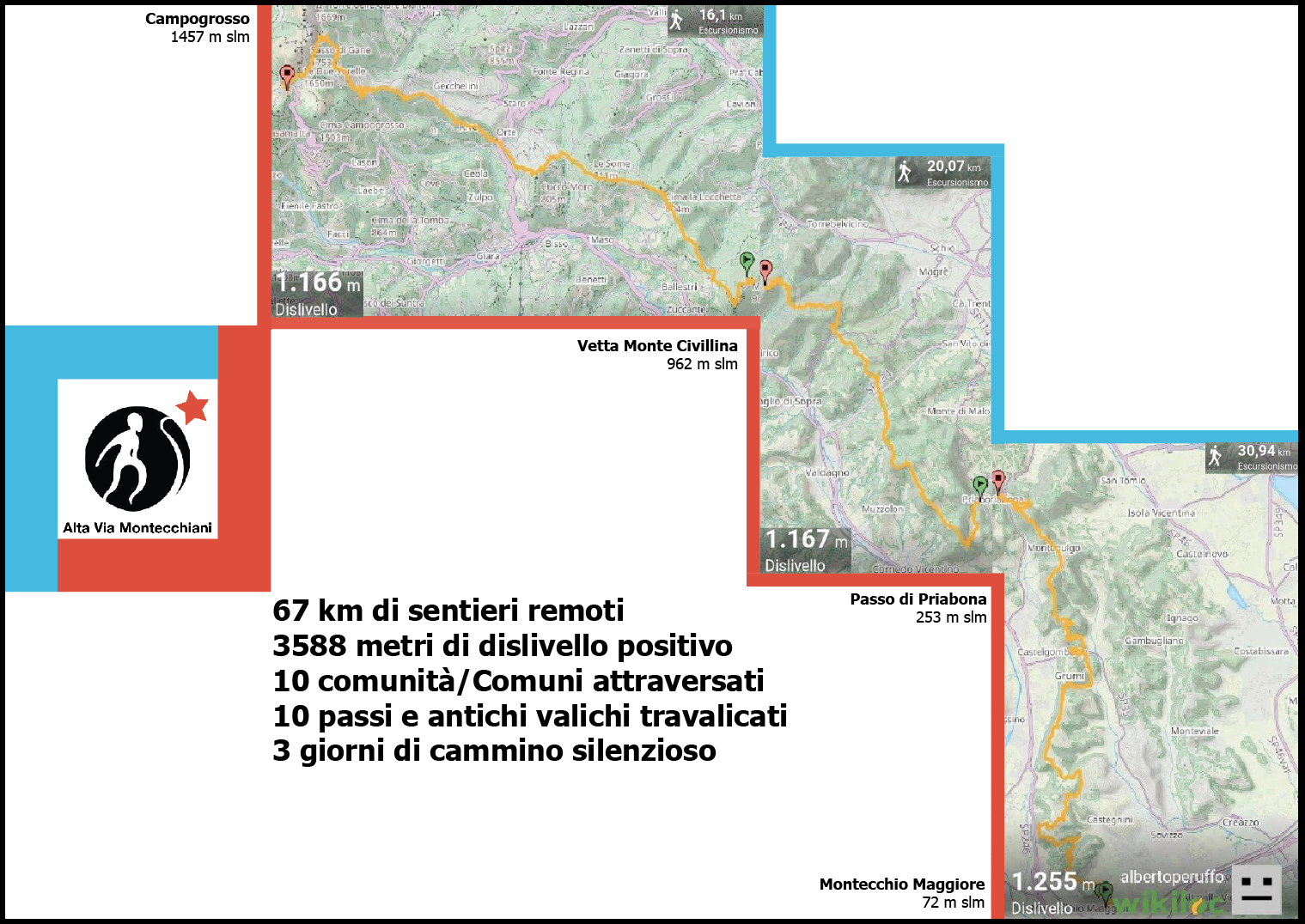 - attraversa, travalica, bordeggia le terre e i monti dei Comuni di Montecchio Maggiore, Trissino, Castelgomberto, Cornedo Vicentino, Monte di Malo, Schio, Valdagno, Valli del Pasubio, Recoaro. Dieci comunità di camminamenti e camminatori.