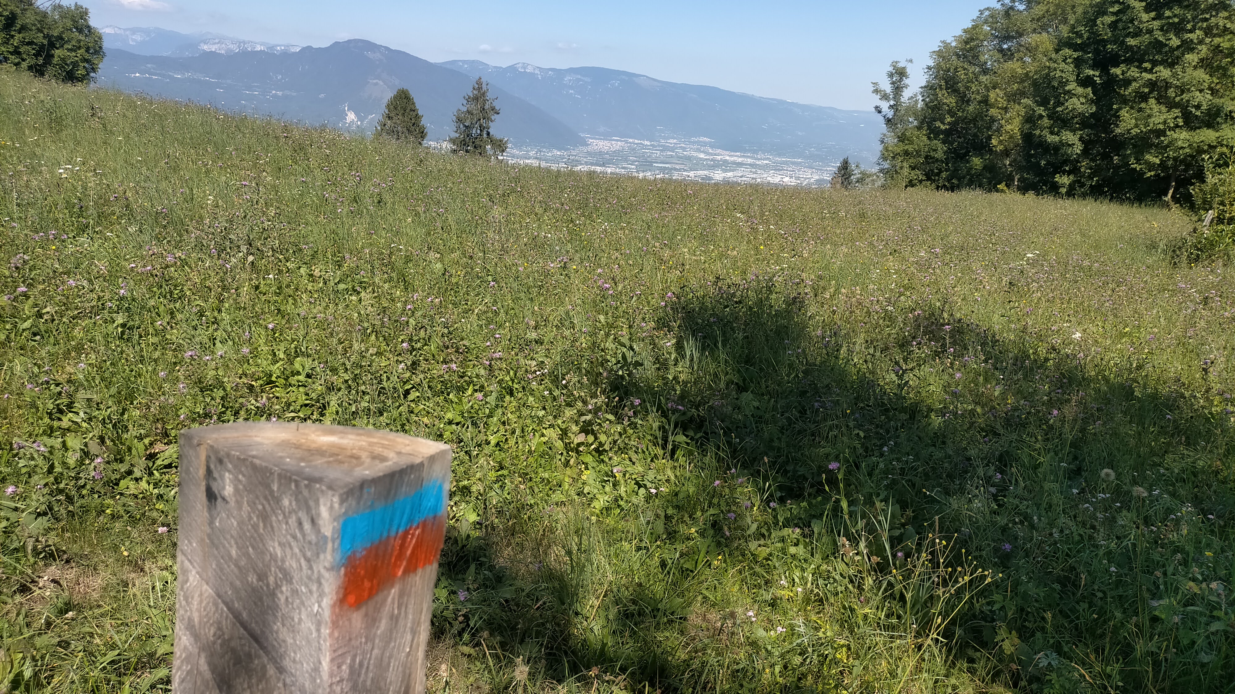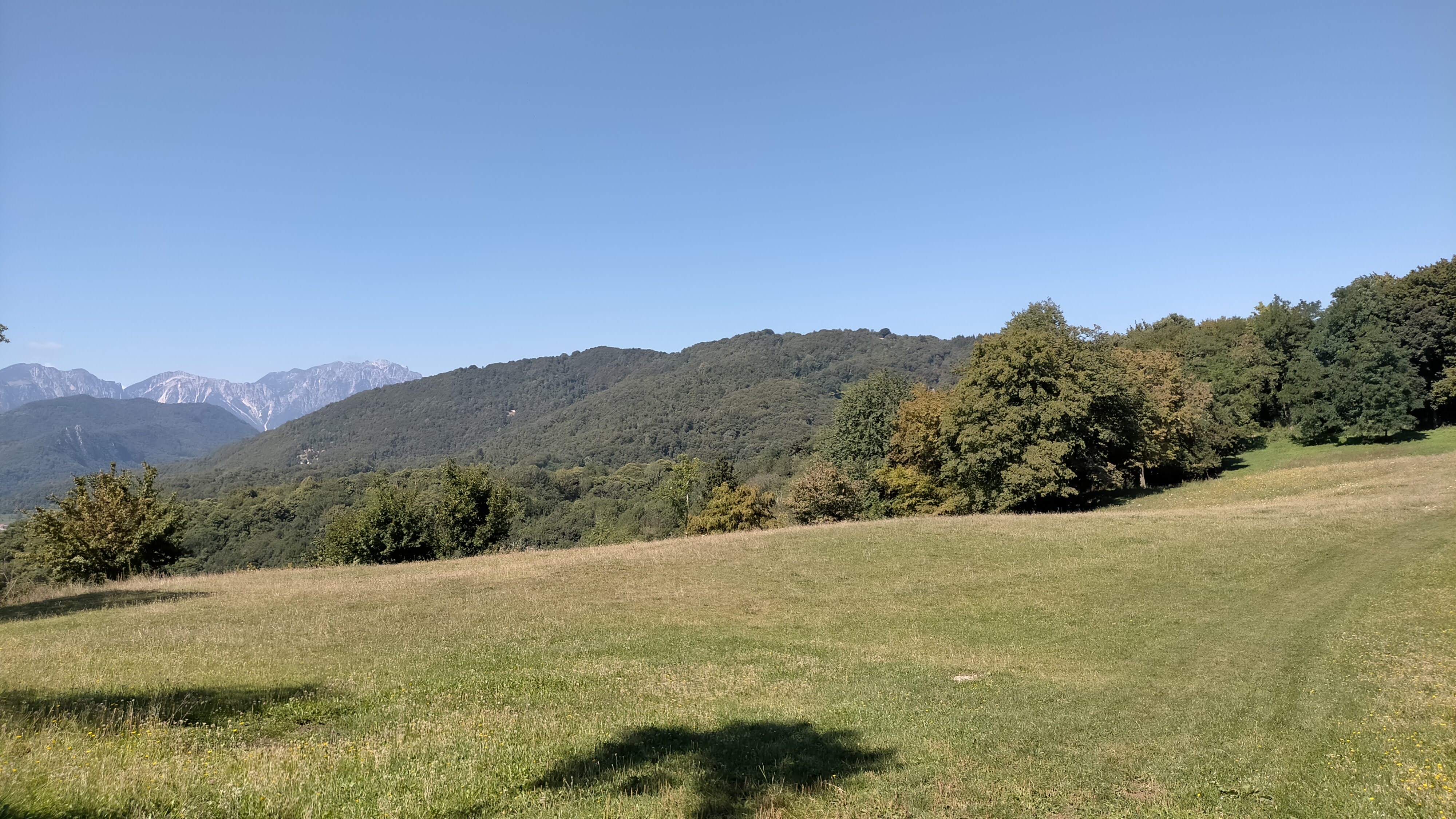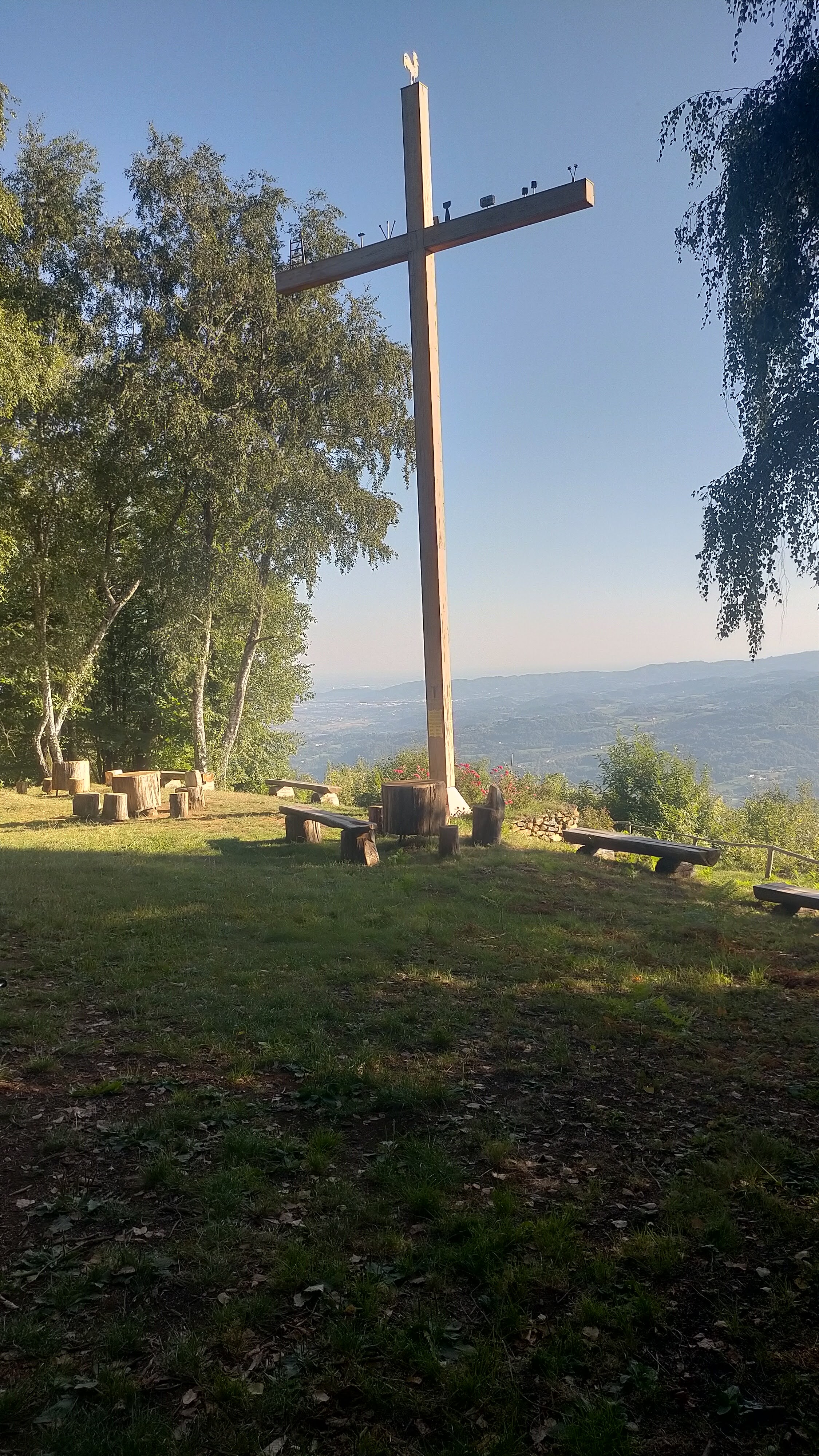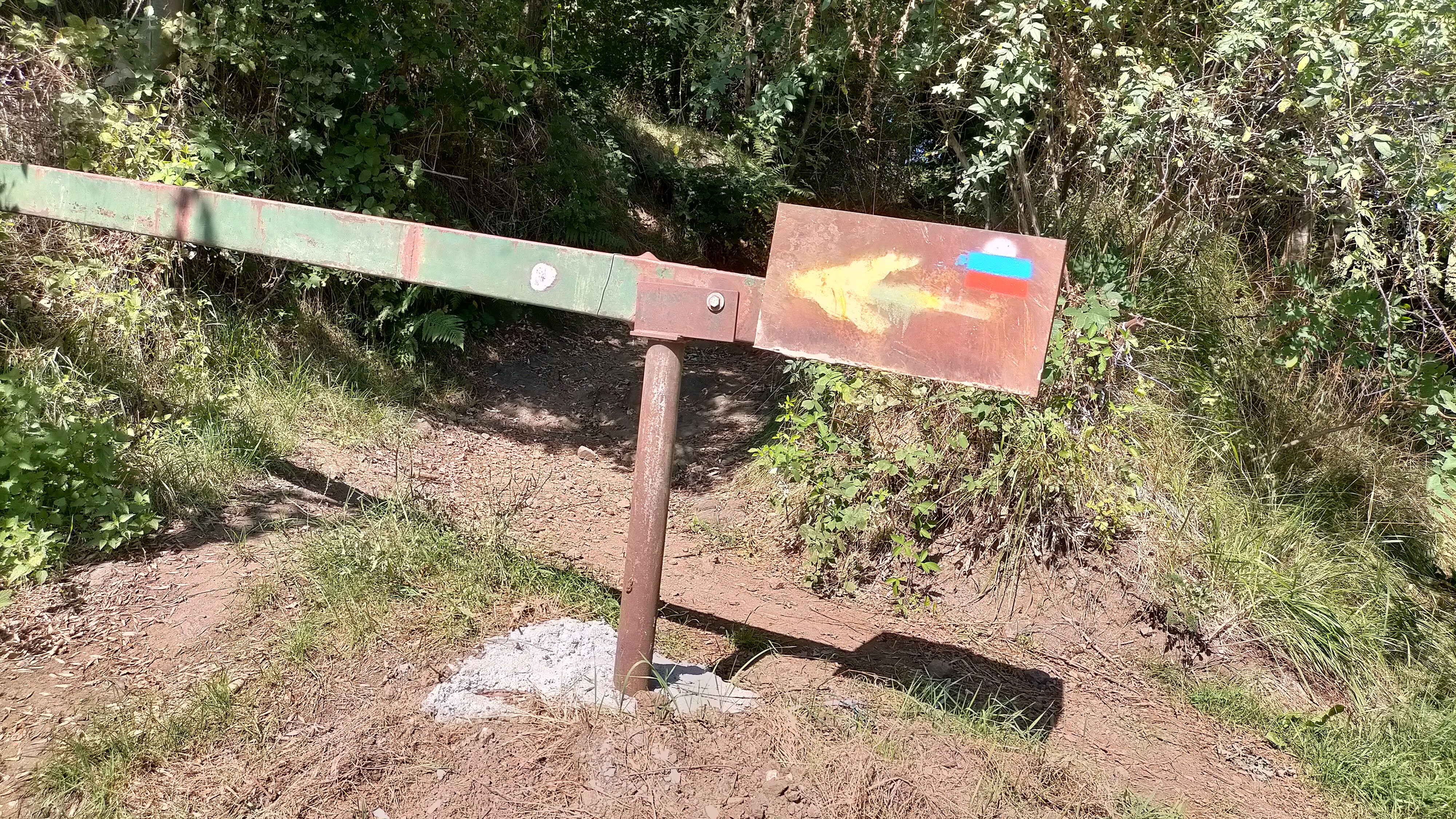 - Usciti dal bosco e passati a fianco di un appostamento di caccia (d’ora in poi se ne passeranno diversi) si riprende traccia-sentiero che si perde in un grande prato con tipica antenna radio a cui si mira per rientrare nella vecchia mulattiera che sale da Contrada Zattra alla Croce della Trinca (dal cui terrazzo con panchine, ampio panorama sopra Cornedo) e finisce alla successiva Croce della Madegona.