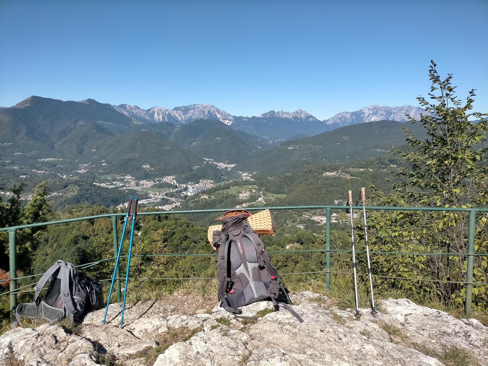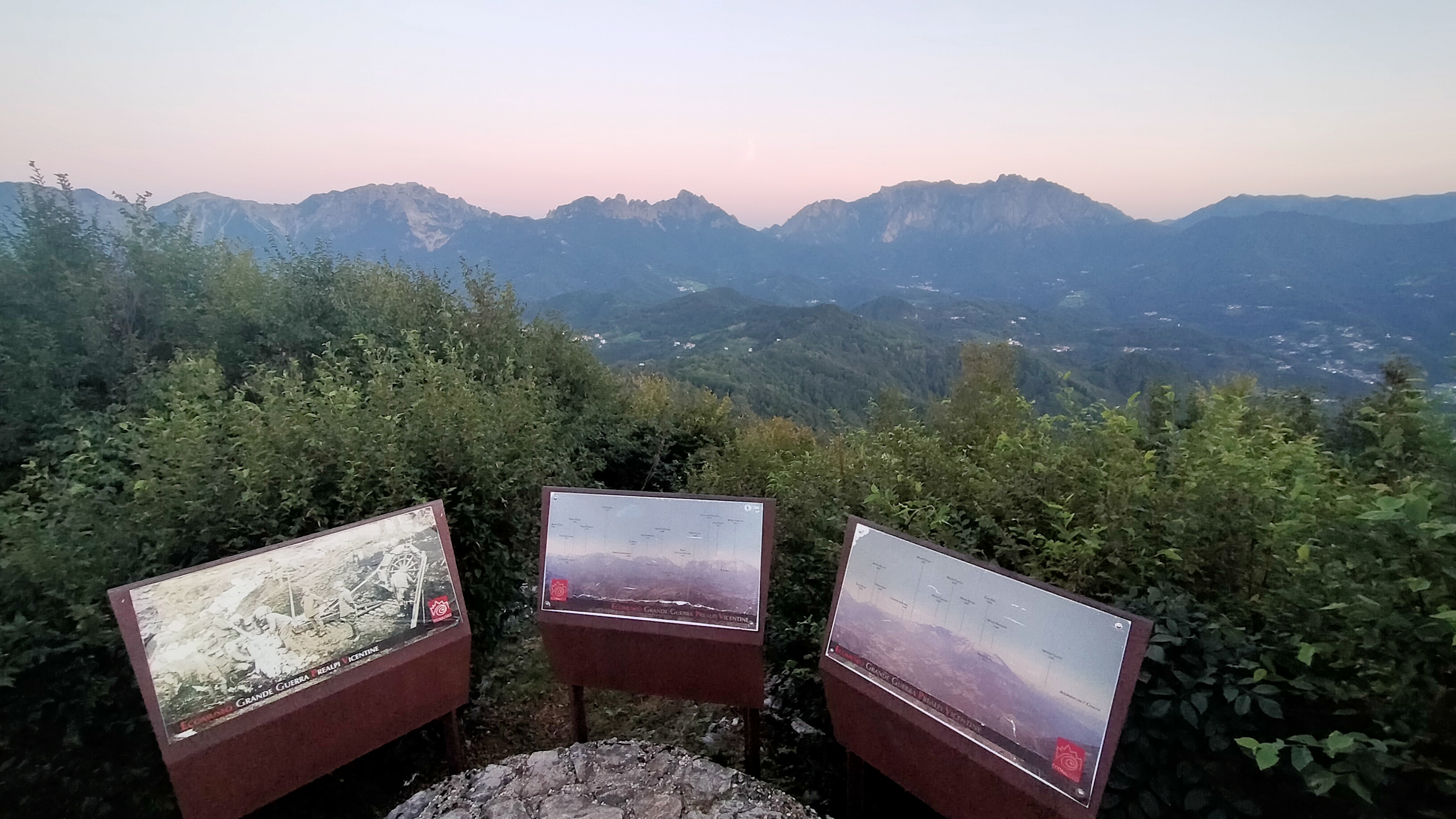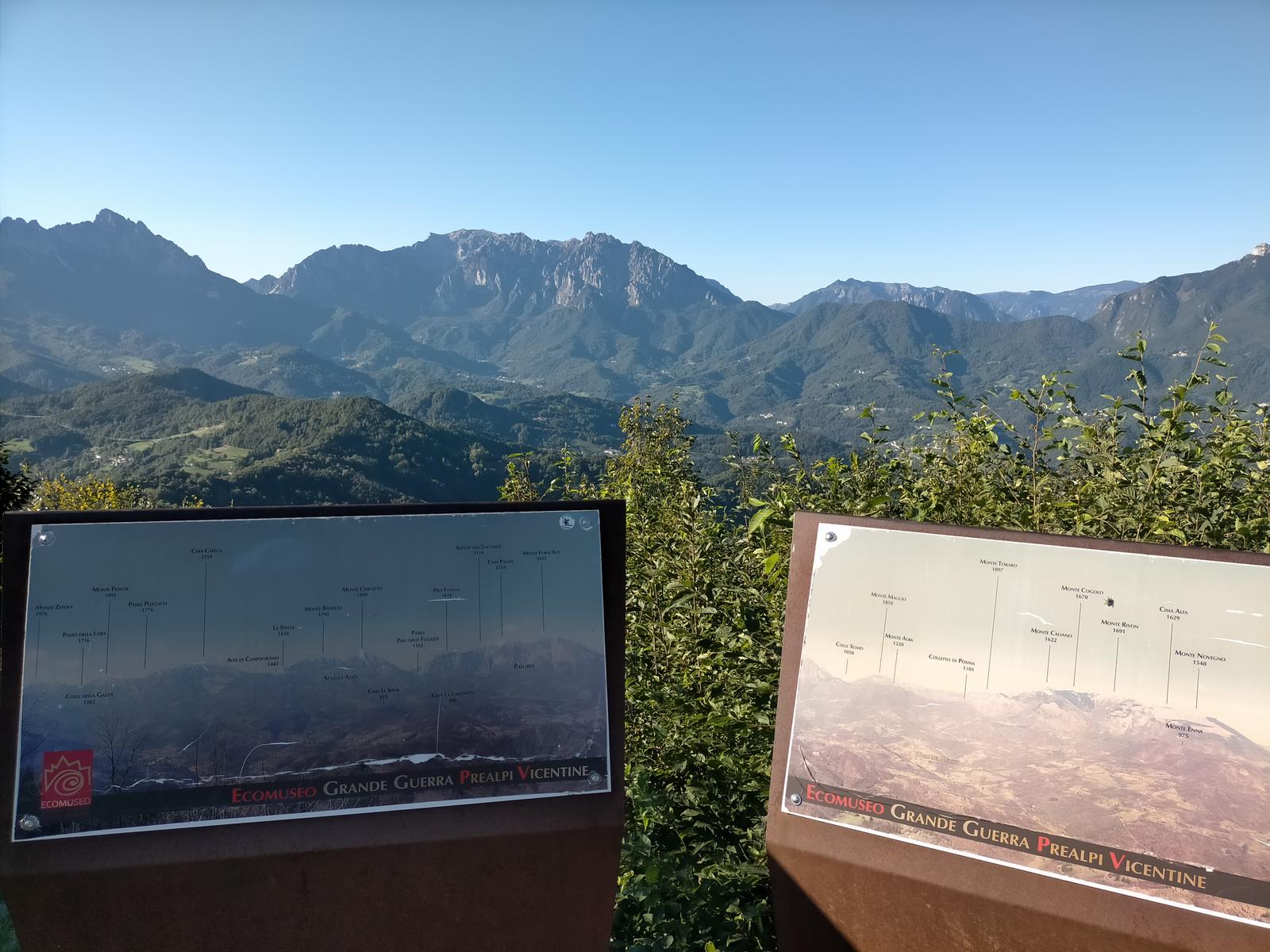 - Pochi metri più in alto, tra trincee e vecchi depositi, tutto ben restaturato e mantenuto, si trova la cima-osservatorio del Monte Civillina, con magnifico panorama su tutte le montagne intorno, in particolare la nostra meta, il Sengio Alto, con il Cornetto e il Monte Baffelan, proprio di fronte, a nord. Ottimo posto per bivaccare e passare una notte sotto le stelle.