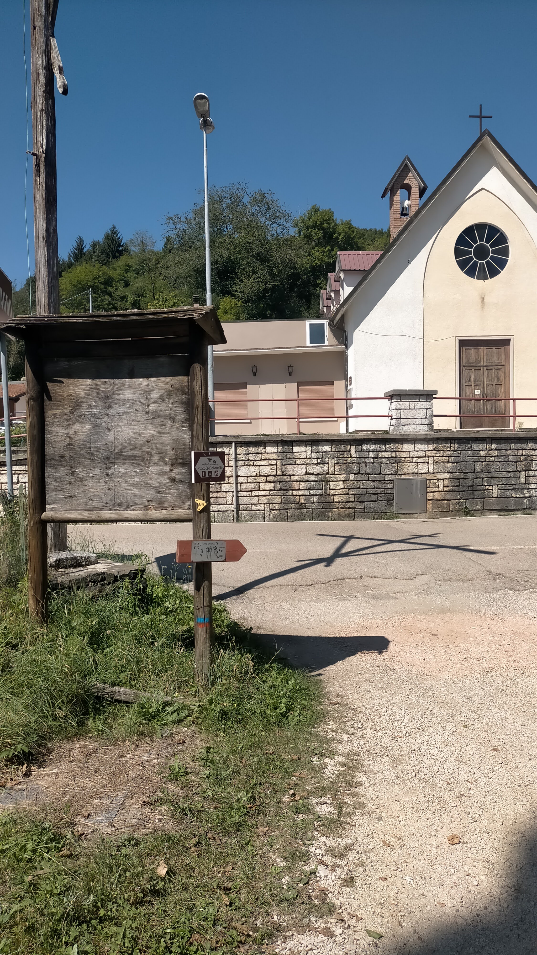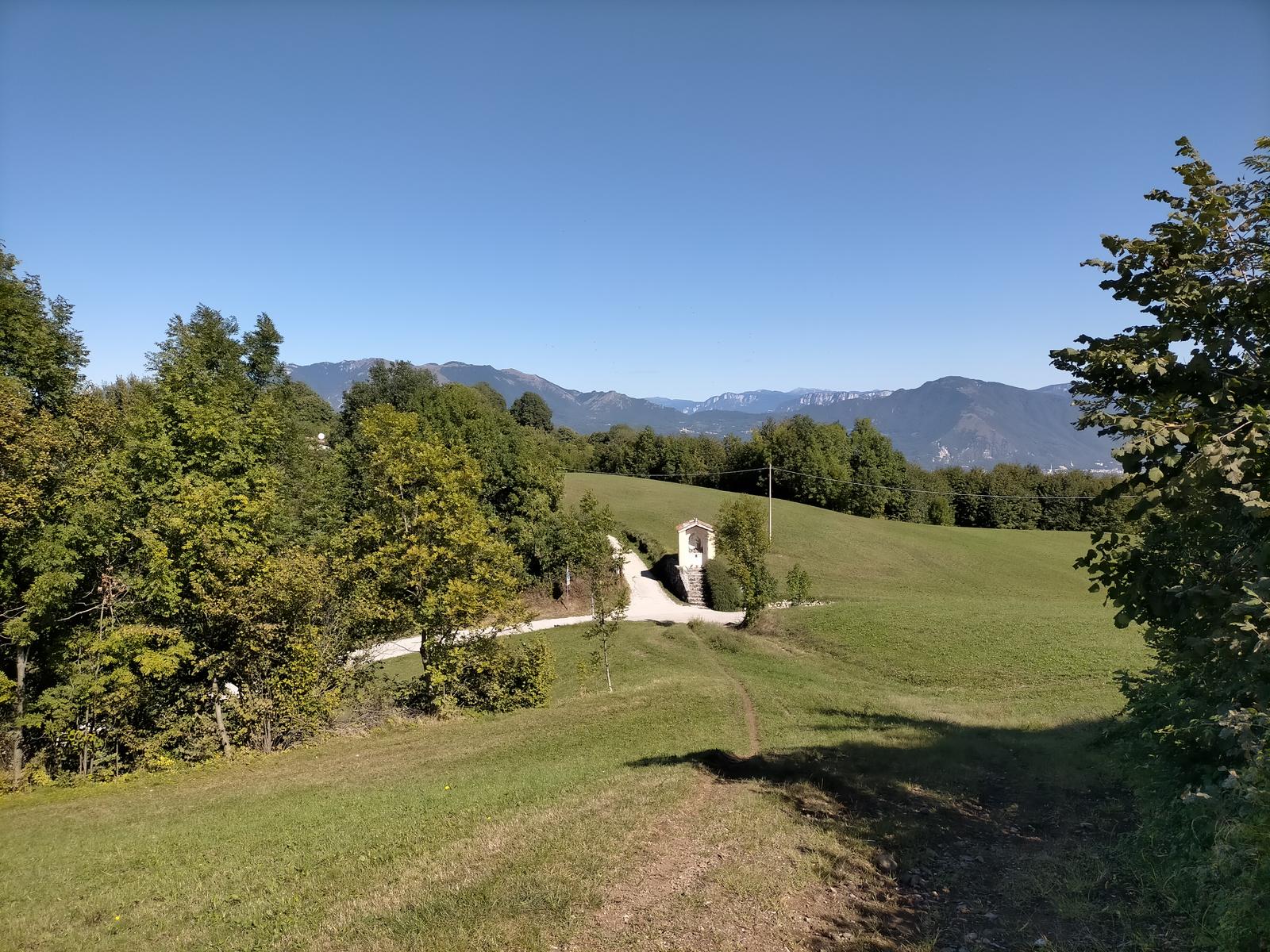 - Si aggira sulla destra la Chiesa del Mucchione, sul lato del campo sportivo, prendendo a sinistra traccia di sentiero che porta subito ad un bivio che porta allo stesso punto di nostra destinazione: la via di sinistra è più lineare e panoramica verso la Valle dell’Agno (intersecando ancora l’Ortogonale, sempre in senso opposto); la via di destra invece si inerpica in un bosco selvaggio per poi scivolare – con variante equivalente nel mezzo dello stesso bosco – sulla medesima strada a cui giunge la via di sinistra: sul fianco di un’abitazione recintata che fa da confine con la strada bianca tra Contrada Bernardi e Località Corbara.
