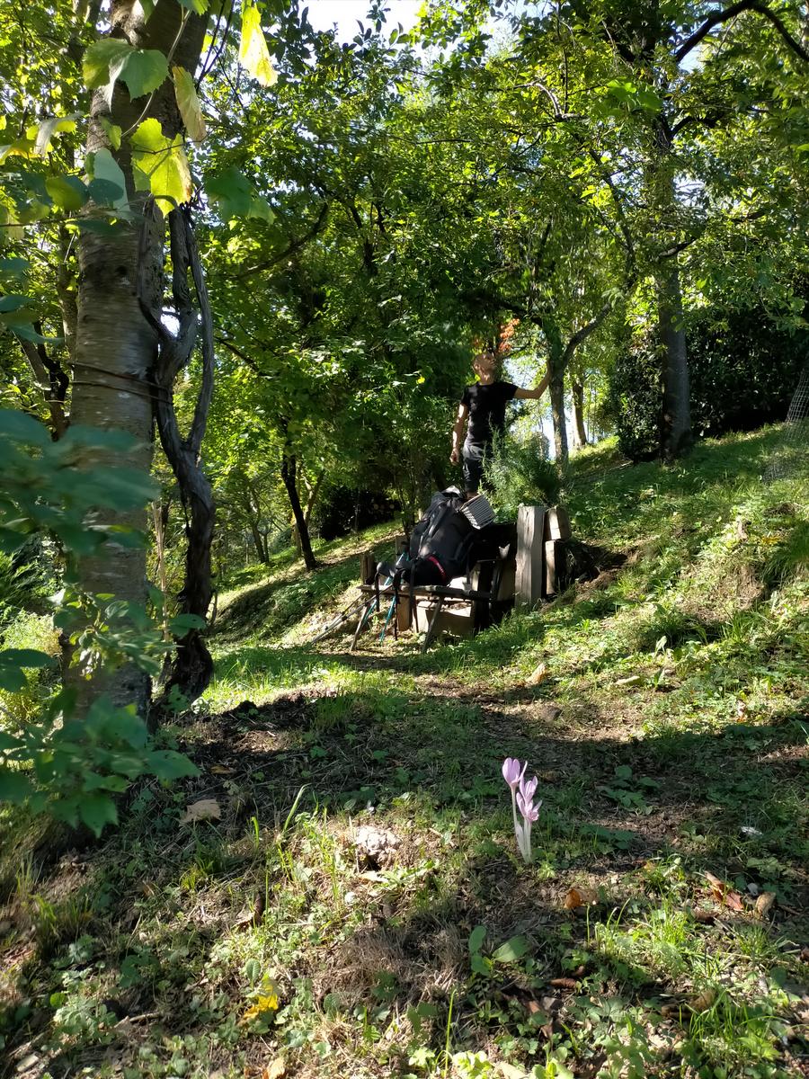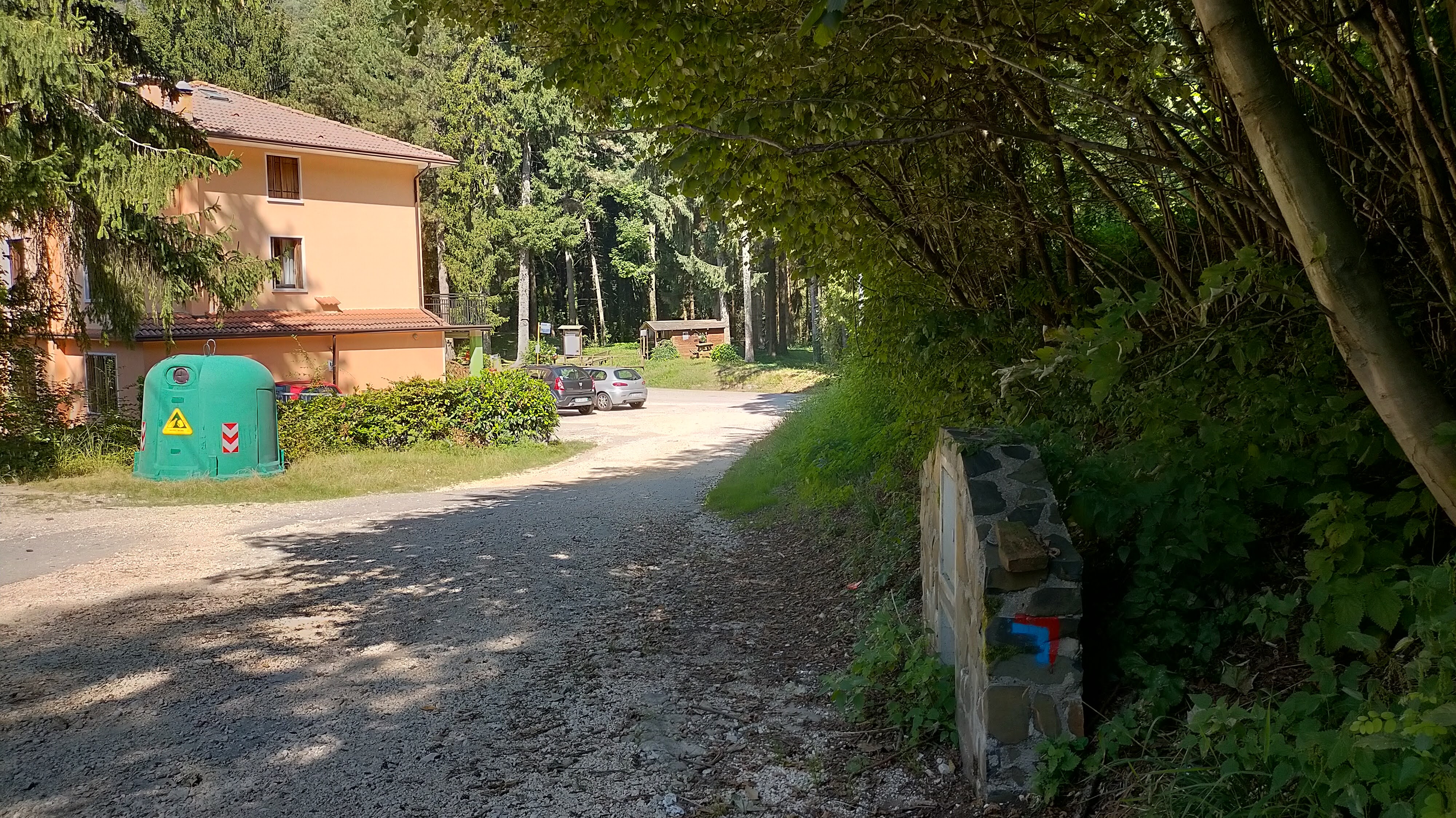 - Lasciato il Ristorante (che offre pure servizio di due camere per dormire) sulla destra dell’ampio parcheggio, si sale direttamente verso le case e i giardini prospicenti, su stradina ripida che porta a una legnaia circolare, da cui parte il sentiero per la Croce dei Bassani o dello Stomita (altro straordinario punto panoramico su tutta l’Alta Via fino a Montecchio).
