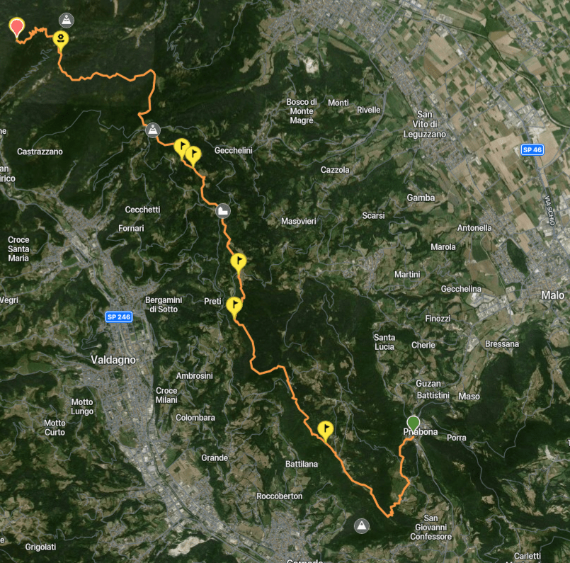 *Nel caso si volesse evitare il Monte Civillina – per la notte o per il dislivello – si può al punto 17 tirare diritto per il Passo Camonda, dove una fontana e lo spazio coperto del capitello locale offrono ristoro e sicuro riparo.